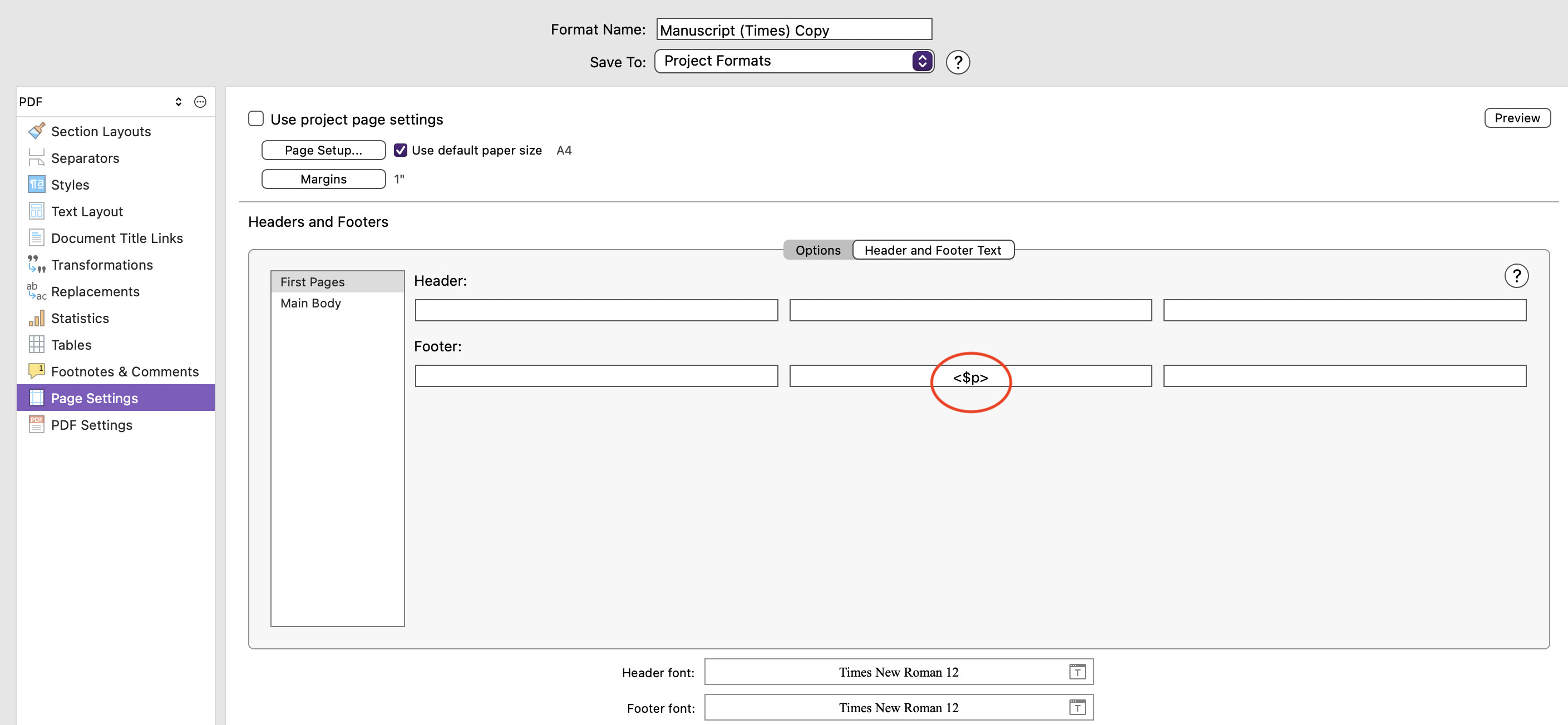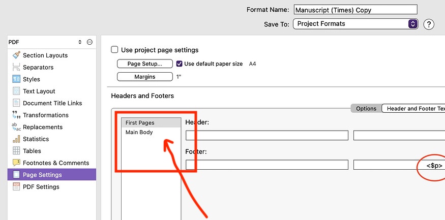 I have checked the page settings of my Compile format - and confirmed this command: <$p> which I think is correct. Perhaps there is a conflict somewhere else preventing page numbers from showing? Please see attached diagram. Is Header and Footer text not the correct location to set page numbers?