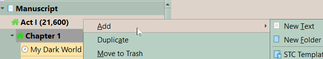 Hello. I’ve recently acquired Scrivener and I’m in the process of loading my project into the Draft folder. The template I chose only comes with two Part folders and I will need to add a few more, but I can’t see how to add folders at that level, only at the level of Chapters and Scenes (through the + down at the bottom). I’ve checked the tutorial but haven’t found anything. Any help appreciated. Thanks. Sharon
