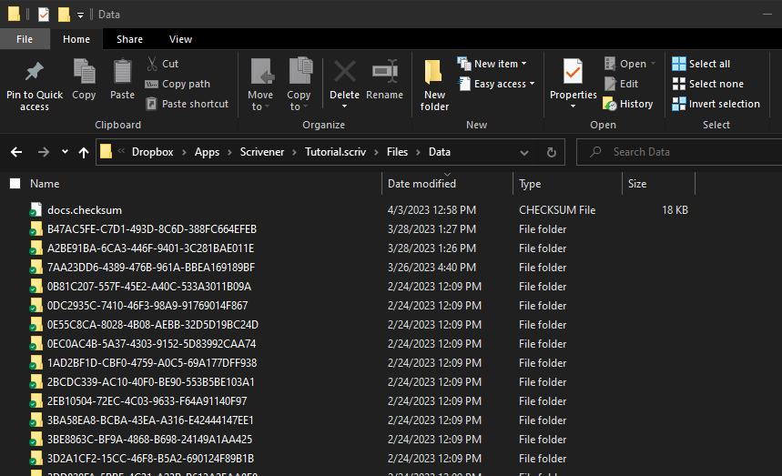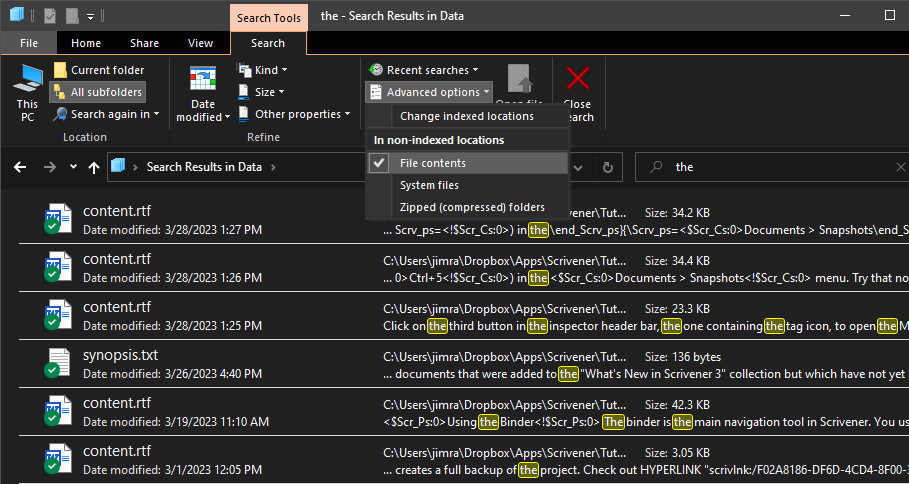 Hopefully you find some or all of your documents with your missing text. If you do, then come back here for next steps–frankly, I’m not sure what’s the best way to get the .rtf back into your project. Perhaps File > Import > Files? Perhaps drag & drop from Explorer back into your project? I’m not sure, but someone will know.
