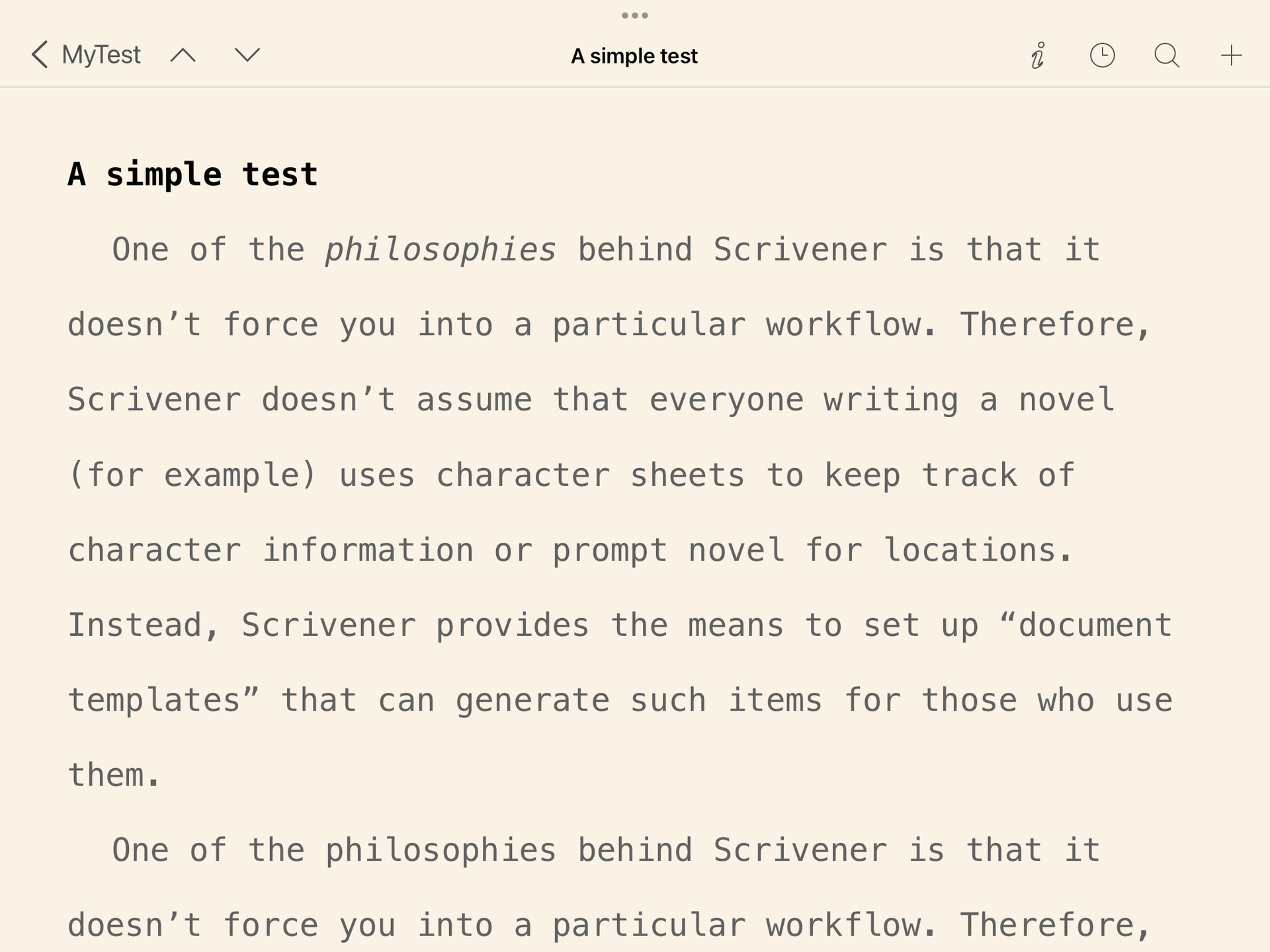 Something missing from Scrivener on the iPad/iPhone is a full screen mode comparable to Compose mode in the desktop version. Some of us prefer to write in this distraction-free environment.