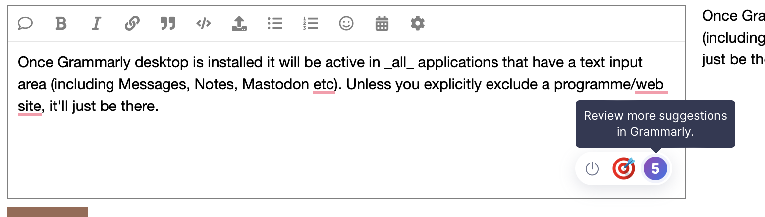 Once Grammarly desktop is installed it will be active in all applications that have a text input area (including Scrivener, Messages, Notes, Mastodon etc). Unless you explicitly exclude a programme/web site, it’ll just be there. (see meta screenshot - Safari & Scrivener)
