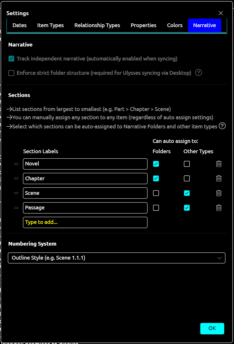 Though Aeon Timeline is a timeline app, its narrative tabs are free of date or timeline constraints, making them ideal for auto-numbering in any writing project.