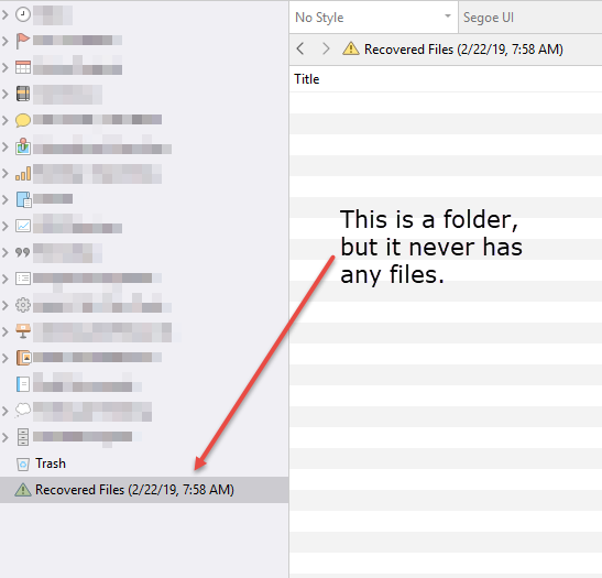 If I’m understanding this thread, the auto-recovery mechanism is for resolving sync errors or other problems, where files might get left behind in the project folders and need to be reviewed. I actually DON’T want to turn this off, because I don’t intentionally put any non-binder files in the project folders, so if there ever IS a non-binder file in there, I would want to be able to review it and possibly recover it. But I don’t quite understand why I’m getting a “Recovered Files” folder every time I open the project (sometimes multiple times a day) when there actually aren’t any files to recover!