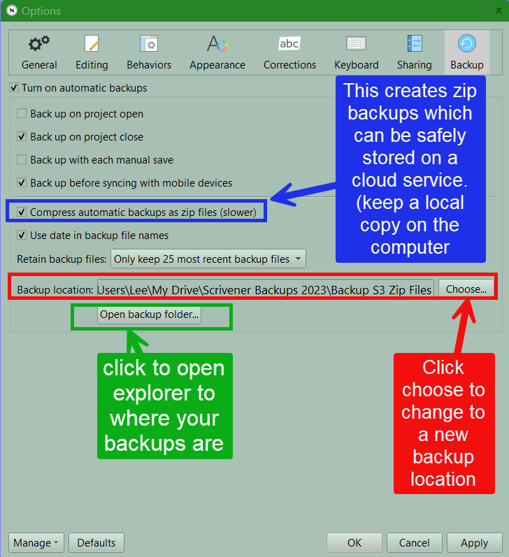 Also you can set your backups to be stored anywhere. Scrivener when set up uses a default location, but I prefer to put zip backups on a cloud backup (google drive for me) with a local copy on the computer. You should also back up externally as well, or use a computer backup service. (I use Idrive).
