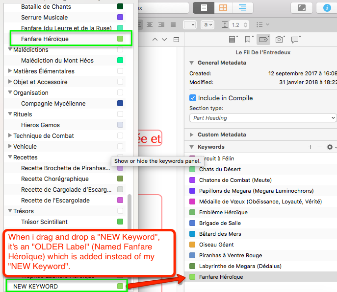 So when i drag and drop this “NEW Keyword” on my text file (in the Inspector or the Binder), it’s an “OLDER Label” which is added instead of my “NEW Keyword”. [See attachment]