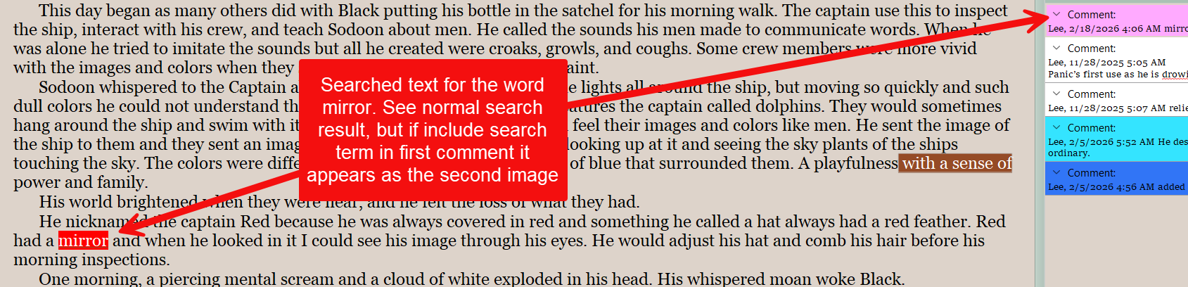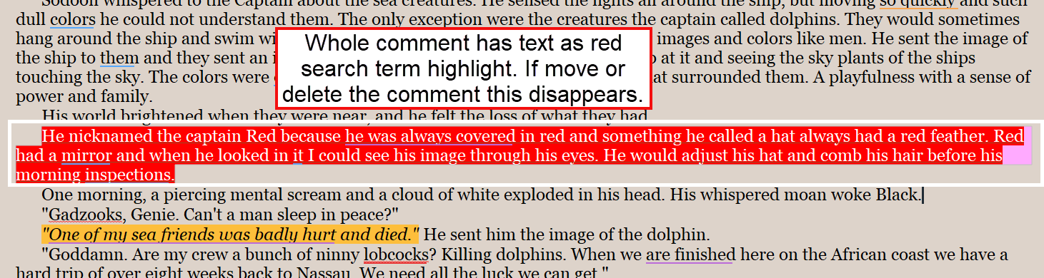 If i do a search and have the search term highlighted, then have a comment include the search term, then the whole sentence including the search term assumes that color. Distracting, is this expected? See images below.