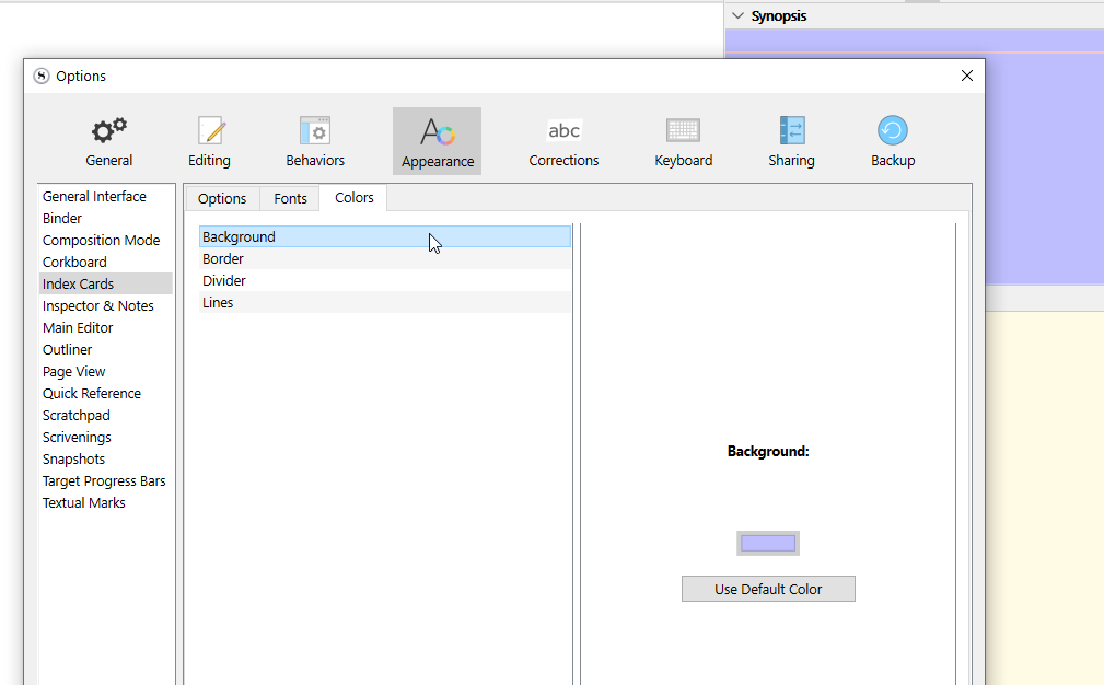 Well, I was able to use the main Editor color in that menu that you pointed out, and it did darken the synopsis signficantly (which is what I need if I can’t change the color of the text to something darker), but it appears the Label color is still overlaying it somehow. If I turn off the label, the shading goes away and it stays as whatever color I select in the Options menu.
