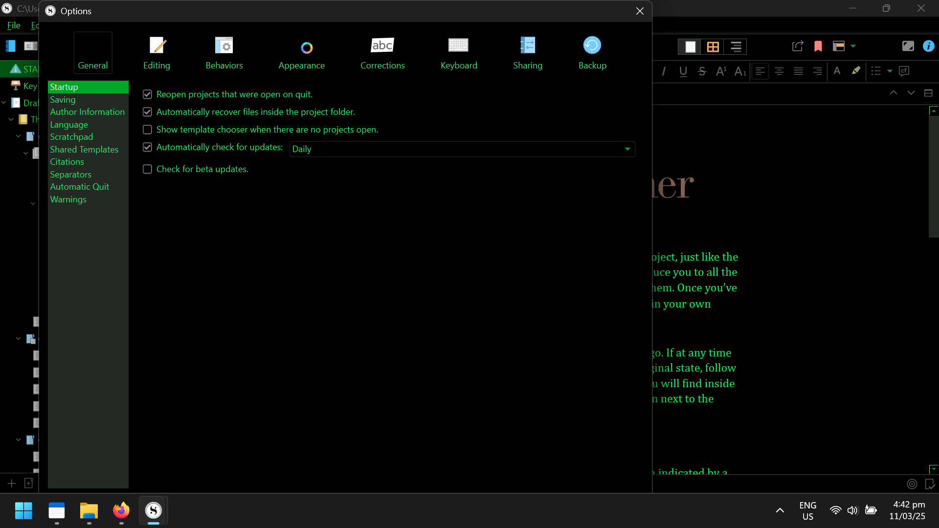 I’m using Scrivener 3.1.6.0 on Windows 11. This was less of a problem on Windows 10 because you could make the taskbar shorter, leaving just enough room to click the top of the OK button. Unfortunately, Windows 11 removed this setting.