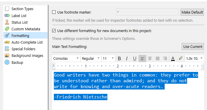 This is the third book I’ve written with Scrivener and each time I am stuck with default formatting because there is no way to change default formatting. Even when I start from scratch I have to change the formatting page by page, and I can’t set the tab stops the way I want. Each new paragraph goes back to default set in Scrivener.