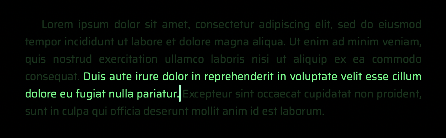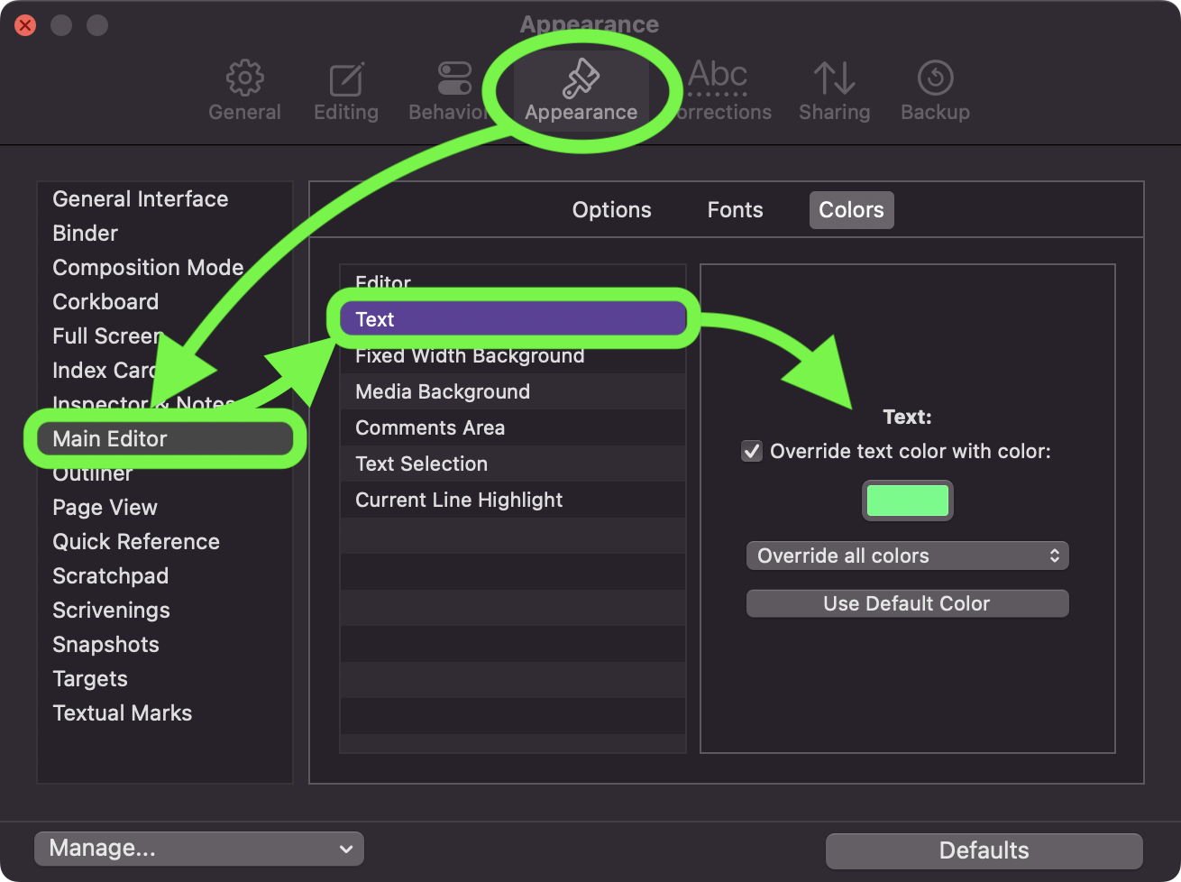 2. The color the text displays in while typing. In a printed book, text is normally in black on a white background. My background is black and I want a bright, electron green font color. In composition mode I;ve got white on blue; I’d like this to mimic the new default, i.e., electric green on black.