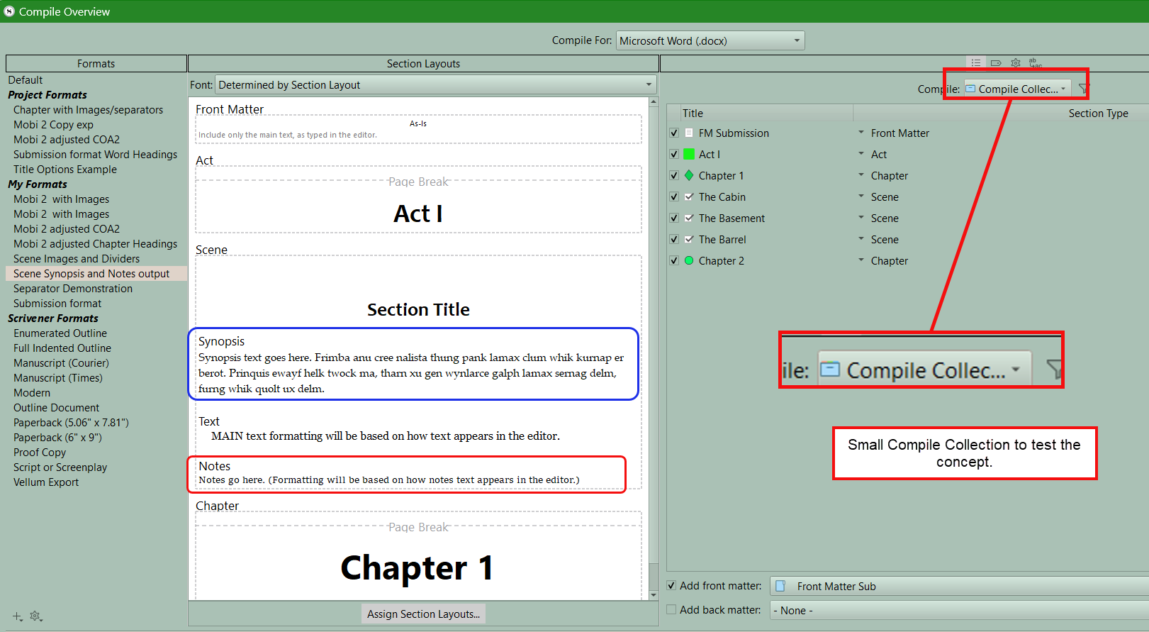 I have a series of compile articles on my website that might help and talk about section layouts and matching with section types. Your need was unique in the desire for notes to be compiled. I suggest a compile collection to practice and test out. (for my novel this includes an Act, 2 chapters to check numbering schemes and several scenes, and front matter) I will compile this and get quick feedback on how things look.