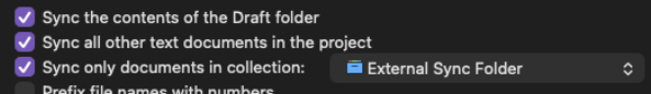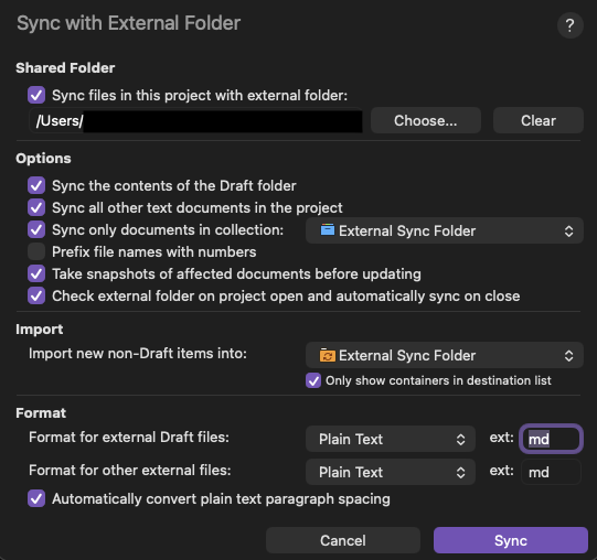 Currently I’m external folder syncing to an Obsidian file. Here are my settings in Scrivener: