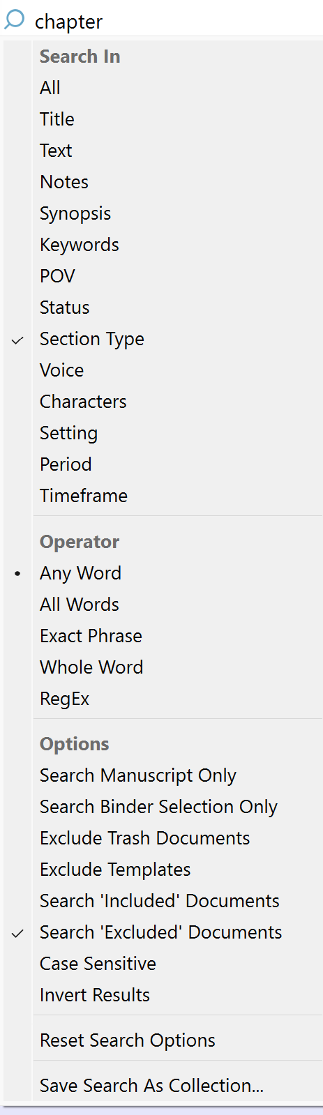 Search will return the Boolean result of the Chapter section type not marked to compile.