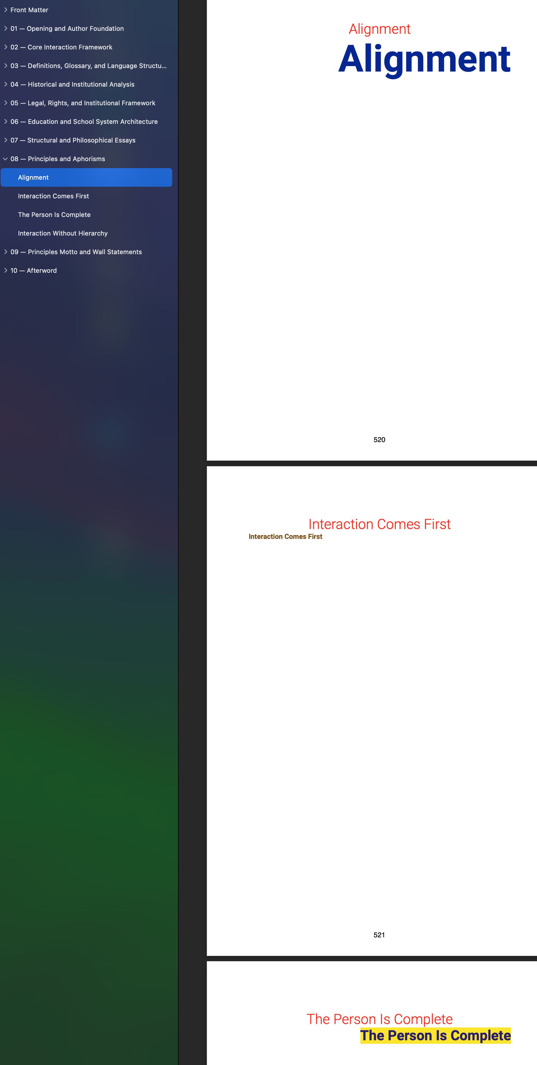 The visible heading inside the text may be longer or more descriptive than the Binder label. This allows the manuscript to use complete titles while keeping the navigation structure concise.