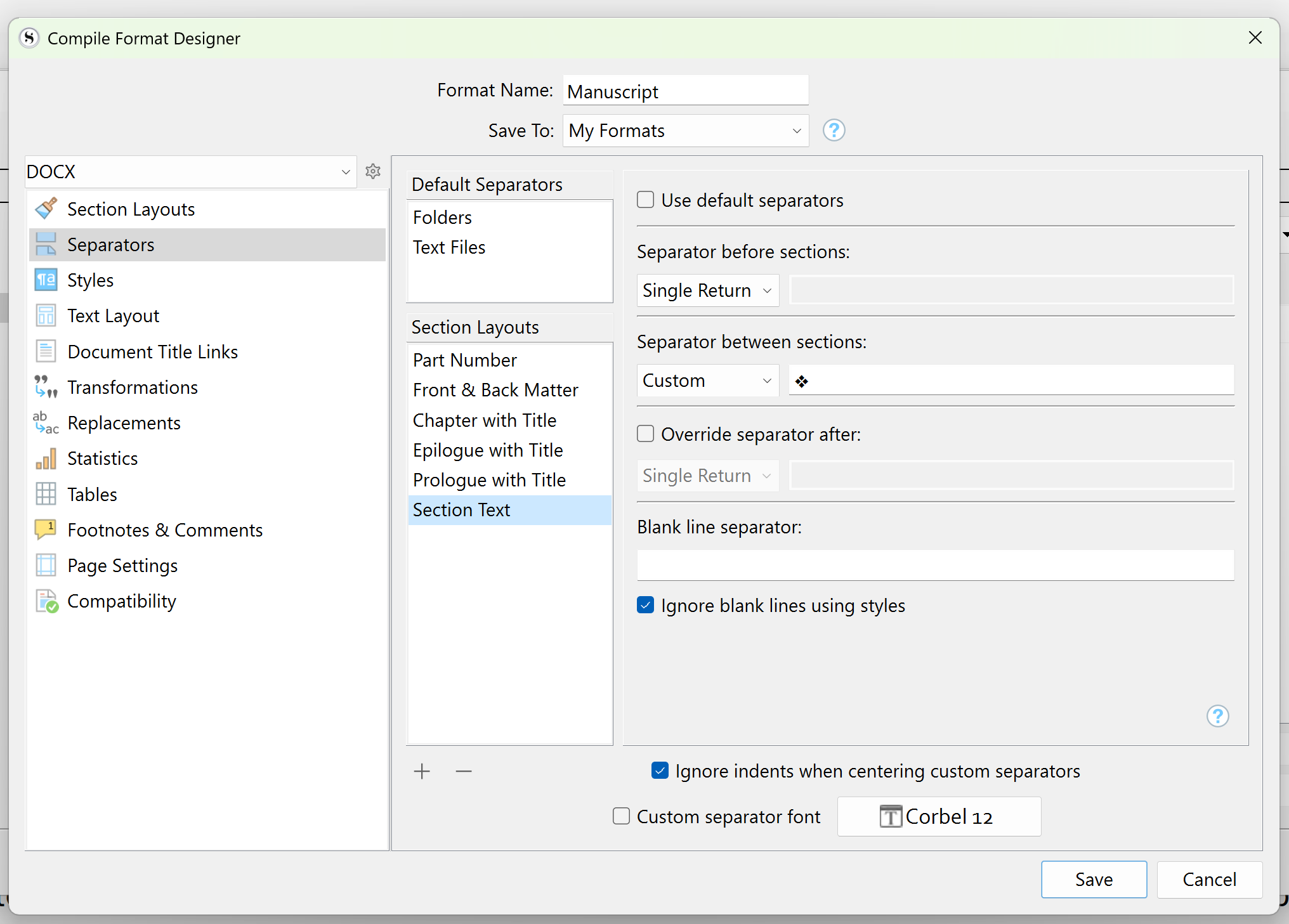 - The random hashes # are probably dividers between your Scenes and per Chapter and can be set in Scrivener’s Compile > Edit Format (of a compile format), then in Format Designer, select Separators and Section Text.