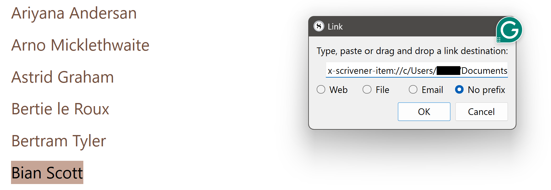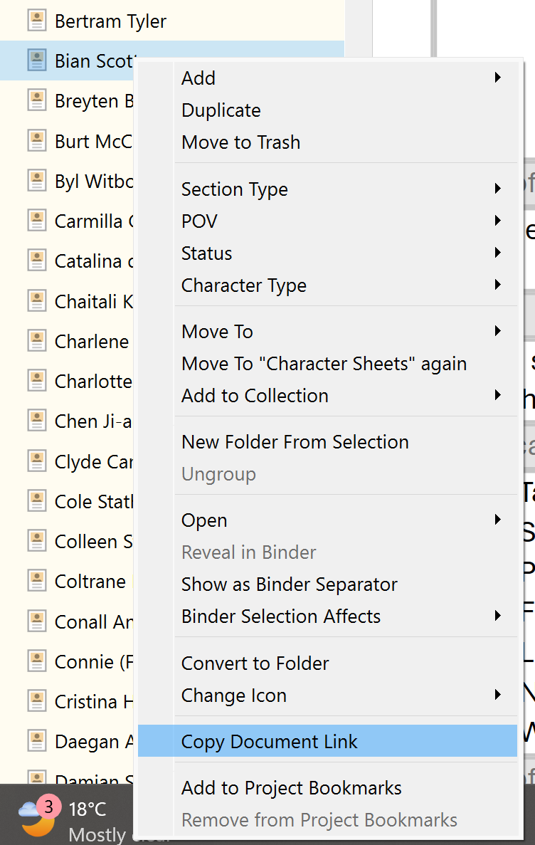 To link to the character sheet in Series Resources, right-click on a Character’s sheet in the Binder in the Series Resources Project, select Copy Document Link, go to the project the character is in, access the list of names in the project, highlight the character’s name, select Ctrl+Shift+L and paste the link. You now have a link to the character sheet in the Series Resources project fro a work in progress.