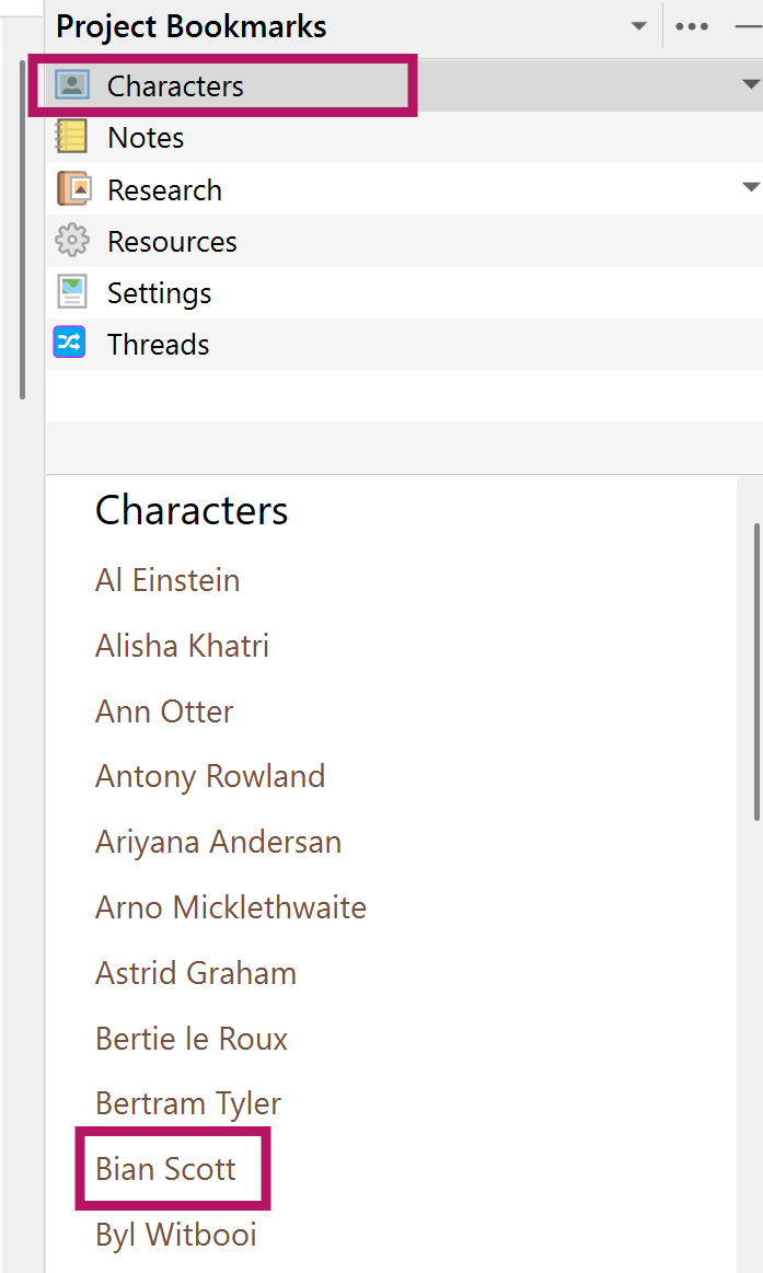 When done linking to each character’s sheet, drag the List of Characters to Project Bookmarks in each project.