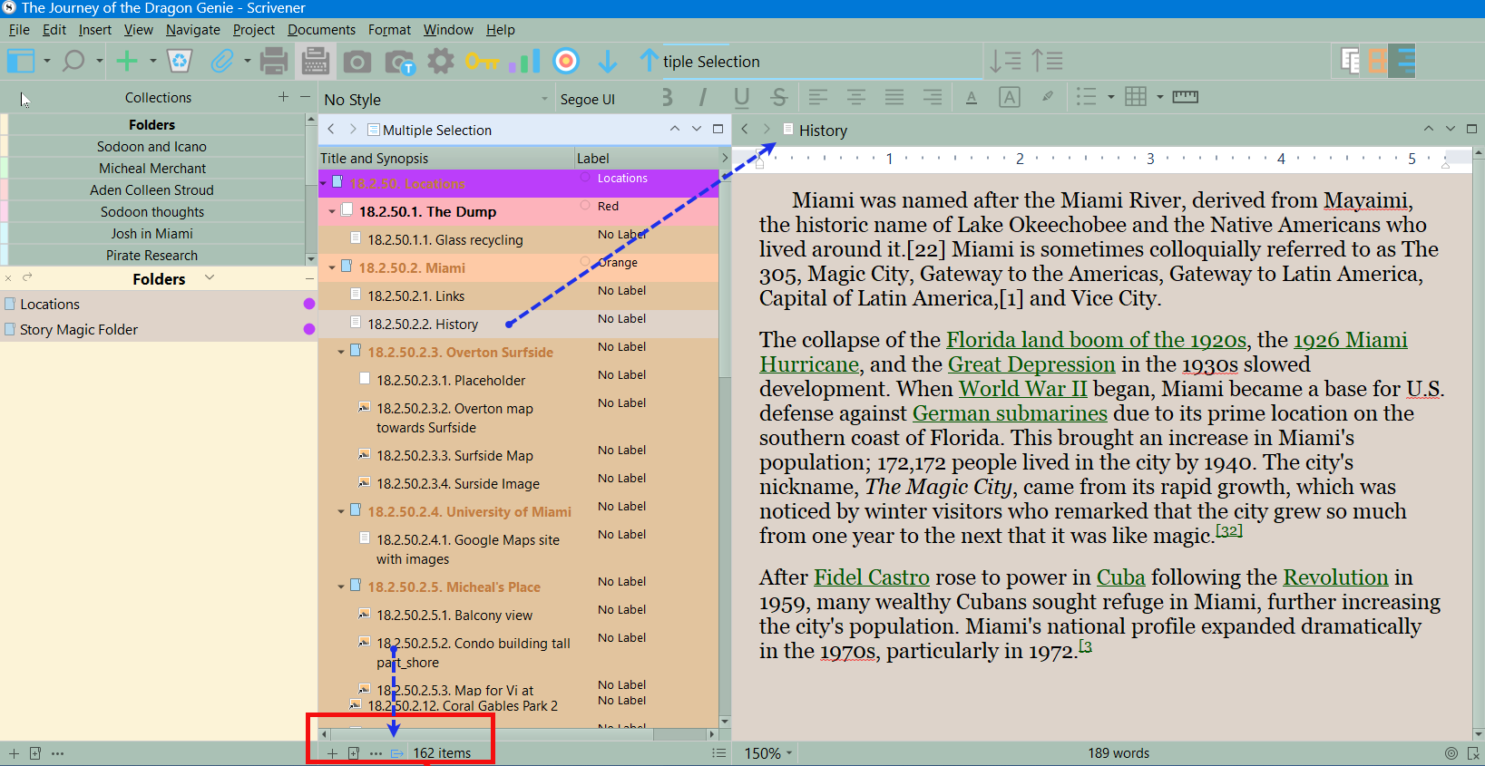 I have a large Research folder with a complex hierarchy and am trying to find a way to make material therein accessible by topic. Specifically, I’m wondering two things: