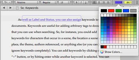 You can also use the Format Bar’s text colour tool. Right-click on it to bring up the swatches pop-over. There are a bunch of useful swatches provided, and any custom ones you’ve created will be listed below the main group as well.