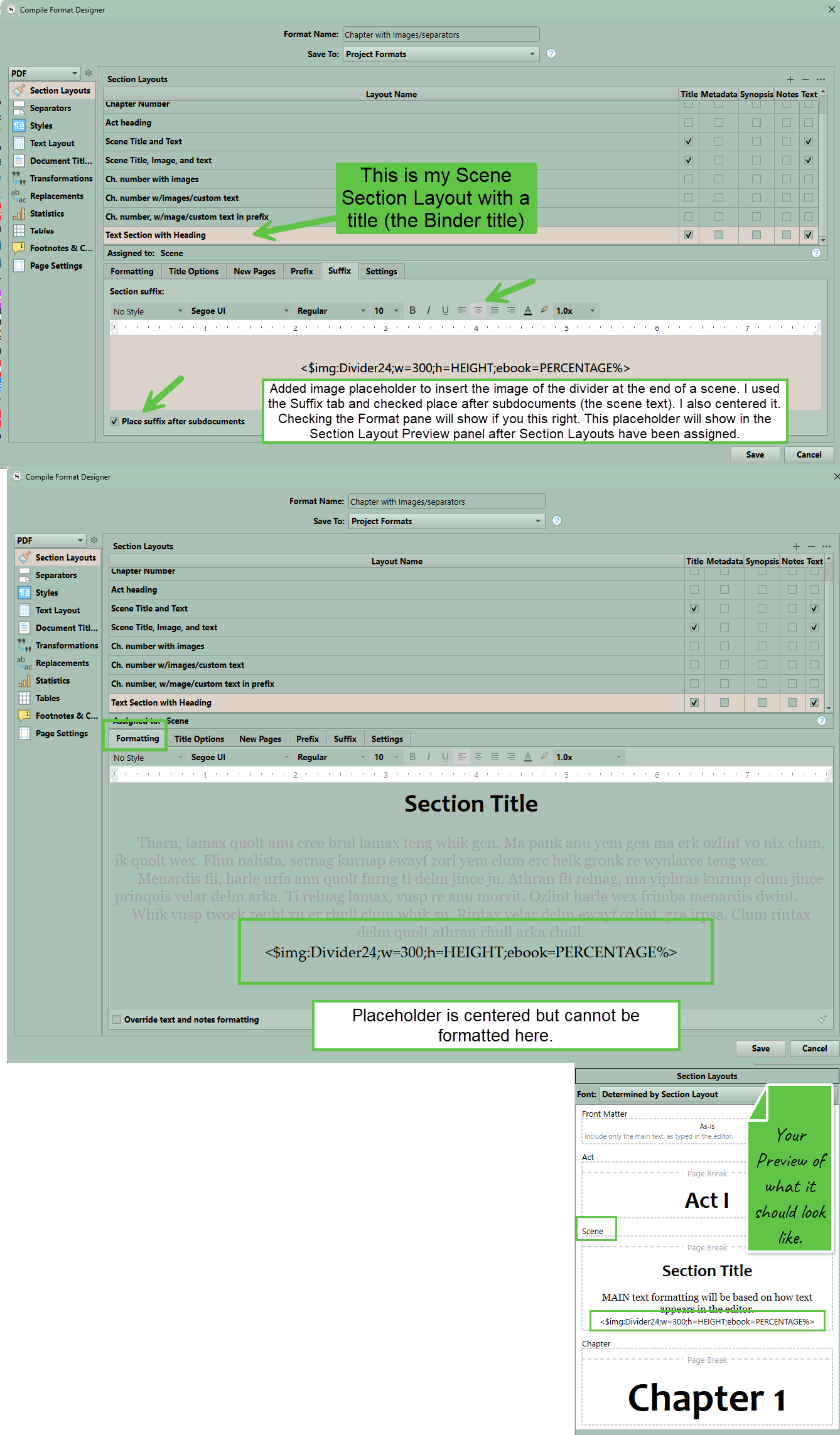 You can use placeholders to insert images or text (unique images or dividers) between Section Layouts of a specific type.