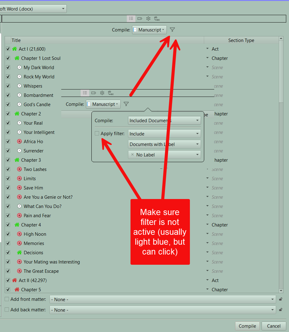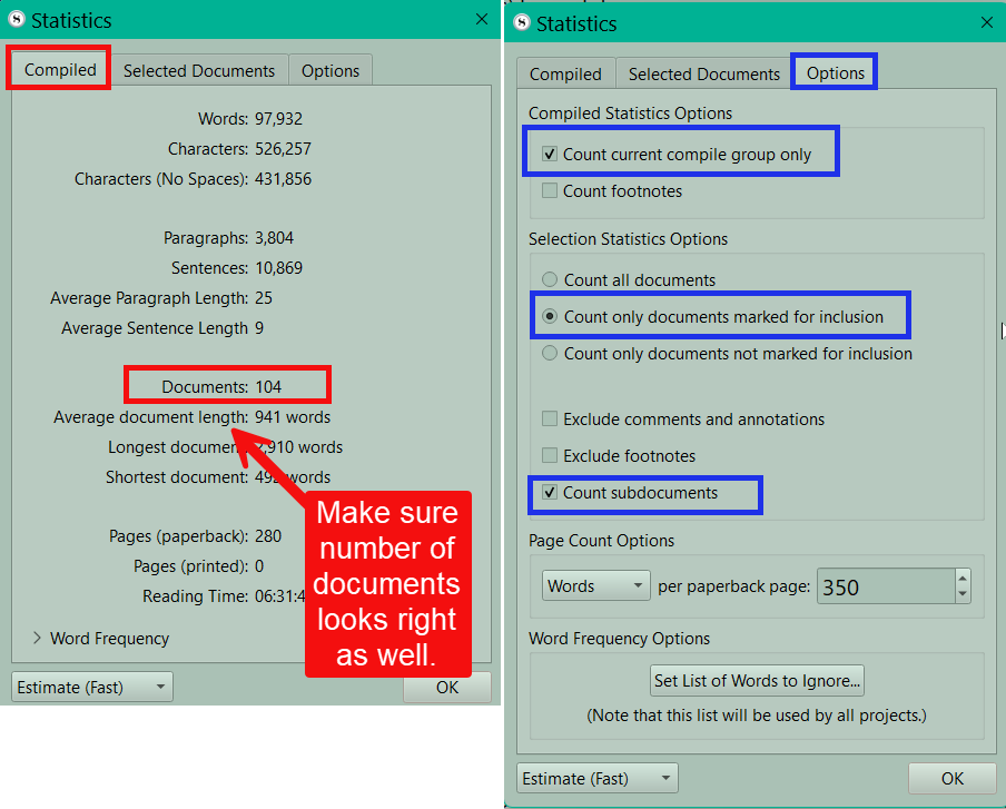 Manually went through and unchecked “include in compile” on each document in my Notes folder (the total word count went down) and then checked “include in compile” on all the documents in my Draft folder (the total word count did not go up).