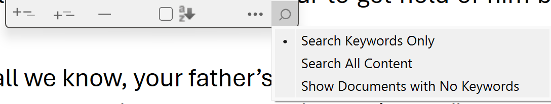 If you’re looking for scenes in which unique combinations appear, invoke the keyword popup, click on the keywords you’re looking for, click on the magnifying glass at the base of the keyword popup, and select Search Keywords Only. The Binder will then list all the documents in which only the combination is found, for example: Pete, Timbuktu, Carving Knife.