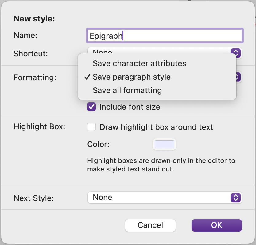 Section Typeas the main text documents, but create an “Epigraph” style. Styles are preserved during compile unless you import that style into the Compile system and then modify it there, or you have already set up a style of the same name in Compile. The advantage of this is that if you want the style preserved, but wish to change your original settings, you can change one epigraph to how you now want it and then useFormat > Style > Redefine Style from Selaction… >and the change will propagate to all of them. - Finally, and more generally, do pay close attention to the Style dialog, particularly the