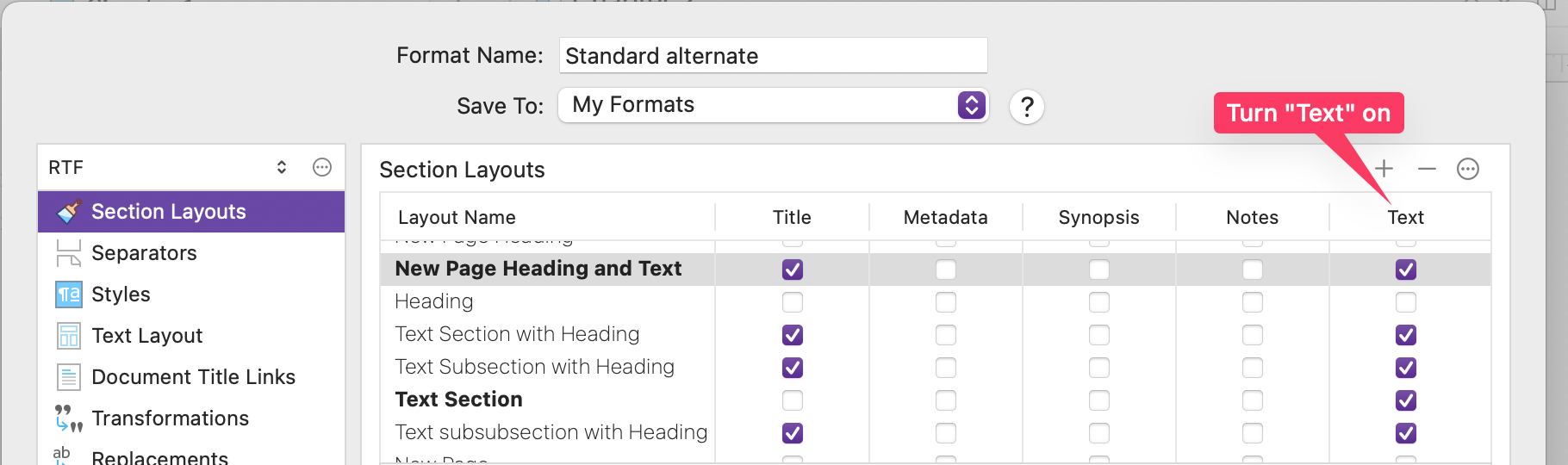 Section Layoutto includeTextfor theSection Typefor your chapters.