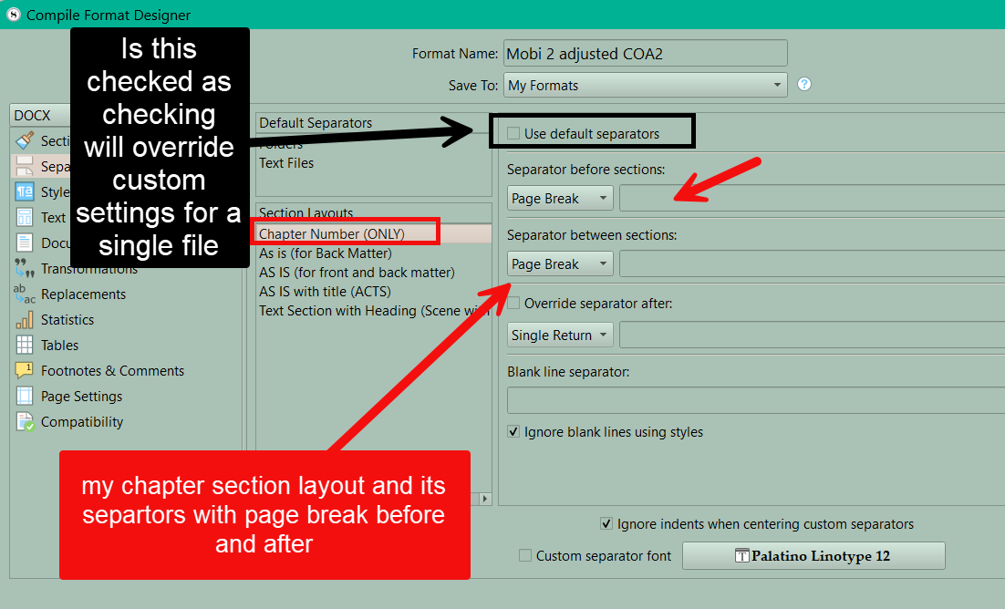 I have also tried using the “Custom” option of “Override separator after”. I can add extra carriage returns with “Opt-return” key strokes in the custom field - so I know that Scrivener is respecting the “Override separator after” command - it’s just not putting in a Page Break (or the readers I am testing with aren’t respecting the Page Break, but I have no way of testing that) when I choose that option.