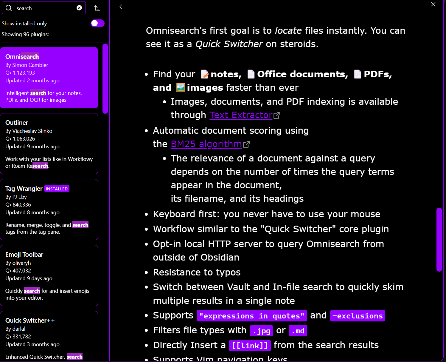 I find keyboard navigation in Obsidian its biggest stumbling block. But that’s probably only because I’m familiar with Scrivener, which does it so well – and demonstrates what’s possible. Once you’ve learned Scrivener’s keyboard commands – for both search and navigation – you can move around enormous sets of documents, using multiple panes, very quickly. Better still if you are conversant with regex. Obsidian just has nowhere near this level of sophistication.