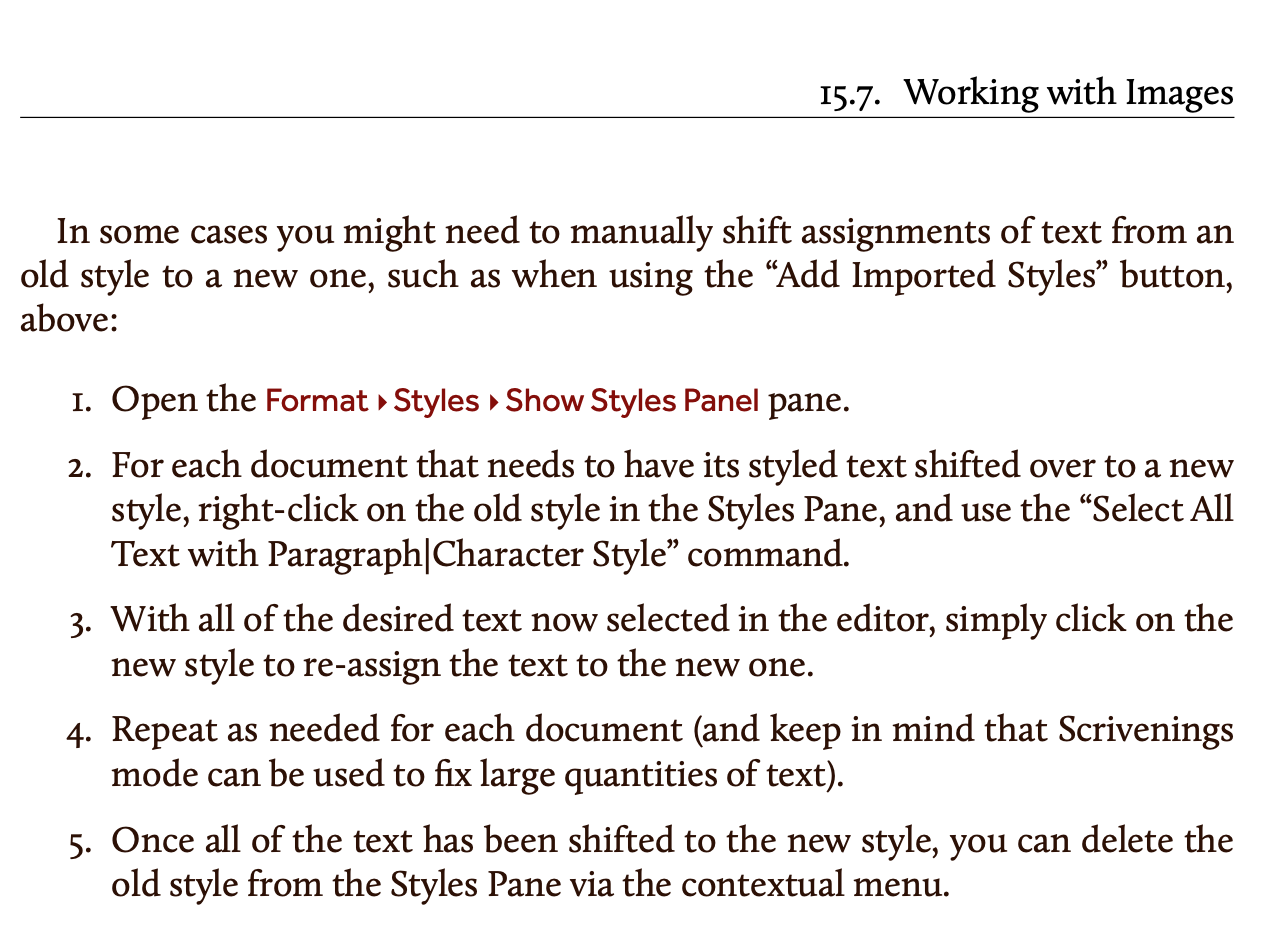 That said, in another more recent posting, November_Sierra pointed me to the Import Styles... feature, which it turns out, holds the key to the Find and Replace by Formatting function I was looking for so many months ago. The relevant passage in the Scrivener Manual is as follows: