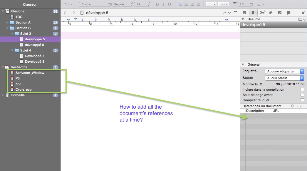 It isn’t possible to select many files in the search section at the same time, and drop them to the reference’s panel of the active document. But that should be very nice and confortable.