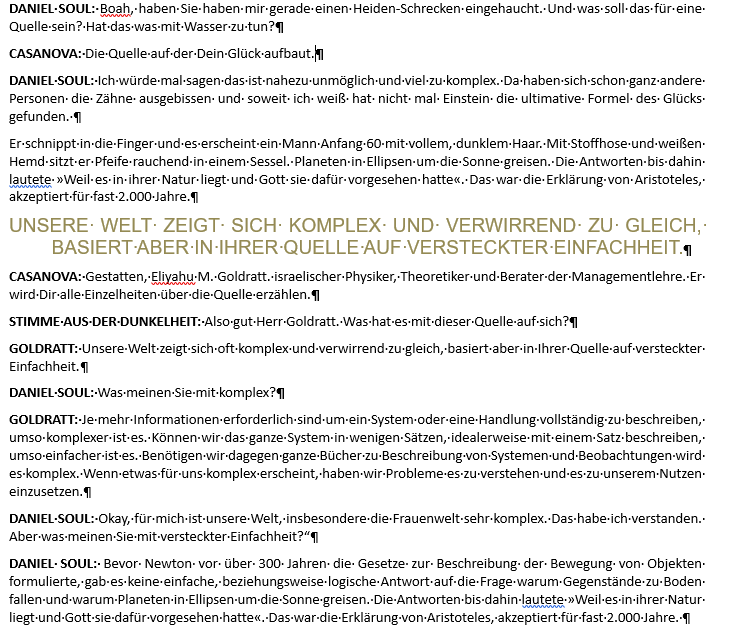 As a lot of customers I’m coming from Word. Here I created 5 macros for each of my characters. Per Shortcut my sentence starts with the name of the person who speaks formatted in bold and then the speach continues in normal text wihtout bold and justified. From here I’m writing my speach for the character. With ALT-RETURN I have a line break in my text.