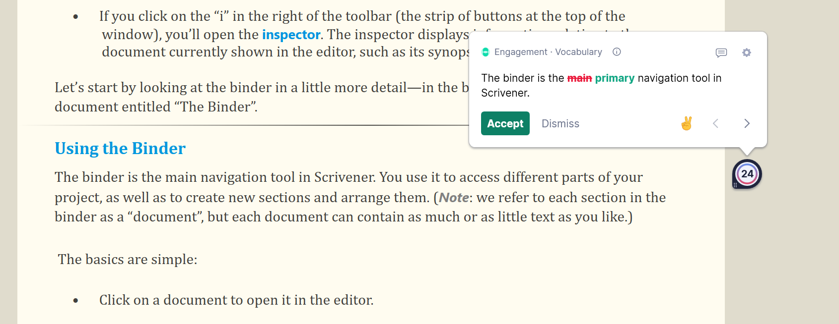 Due to incompatibility issues with Scrivener, we turned off Grammarly in this app.