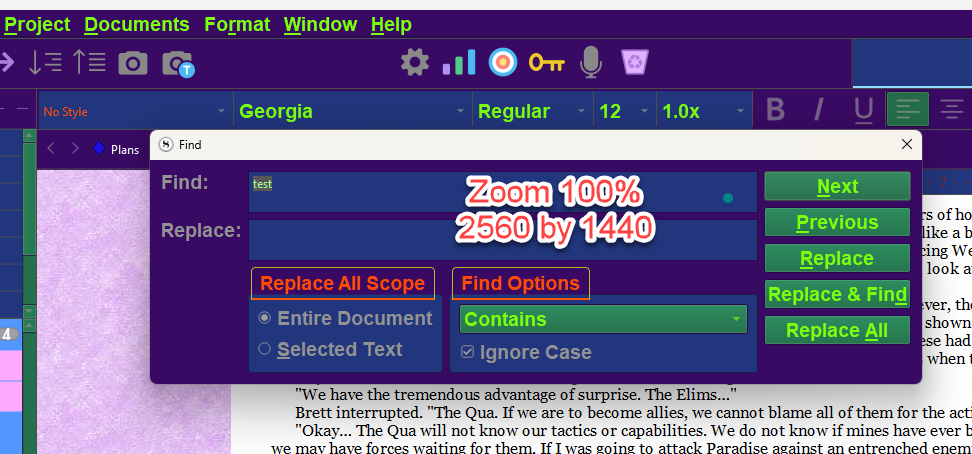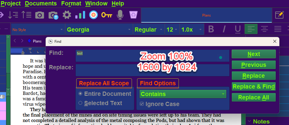 My display resolution is 1920 x 1080, too low to test this theory. But @GoalieDad or @Puffysmoke – please set your screen resolution low enough that you can read all the text on your display comfortably at a 100% scaling setting. With that configuration, if the ‘find text’ interface element text is the same size as the text on the rest of the Scrivener display, then I think that would prove this is the cause of the bug.