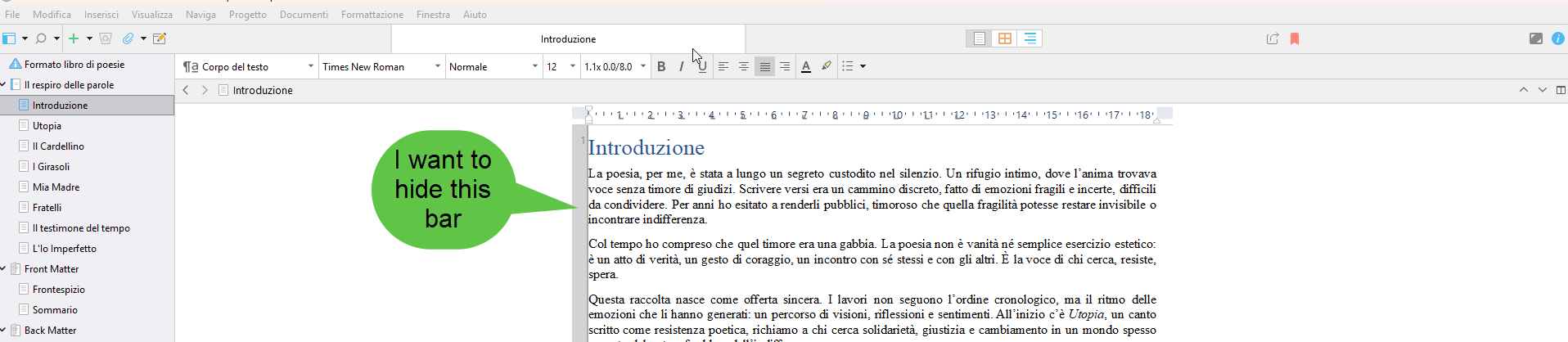 How can I hide the bar highlighted in red in the image in Scrivener 3?