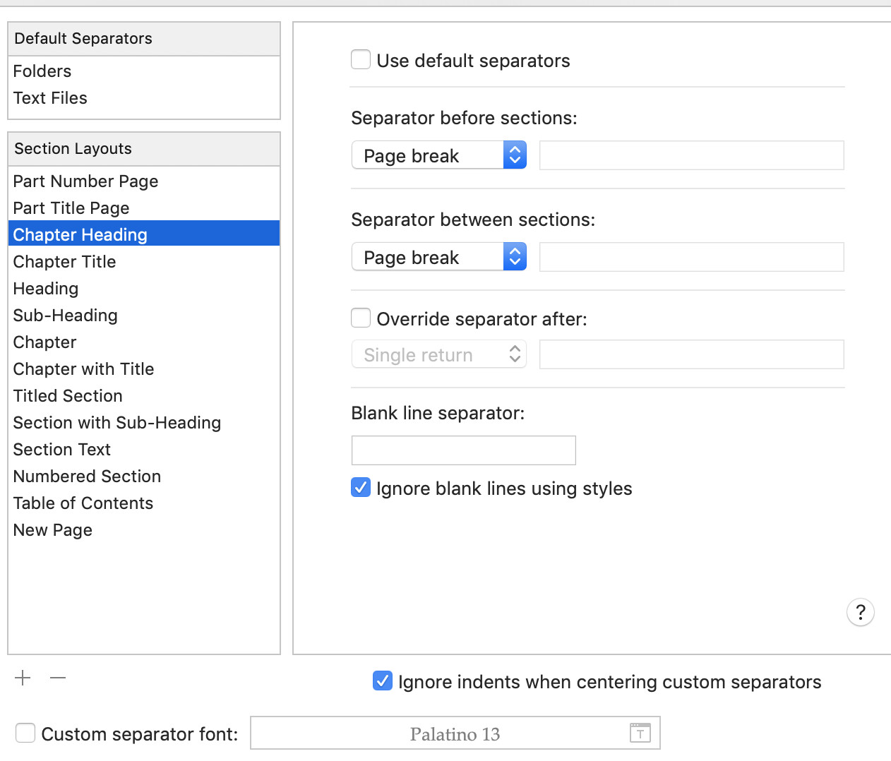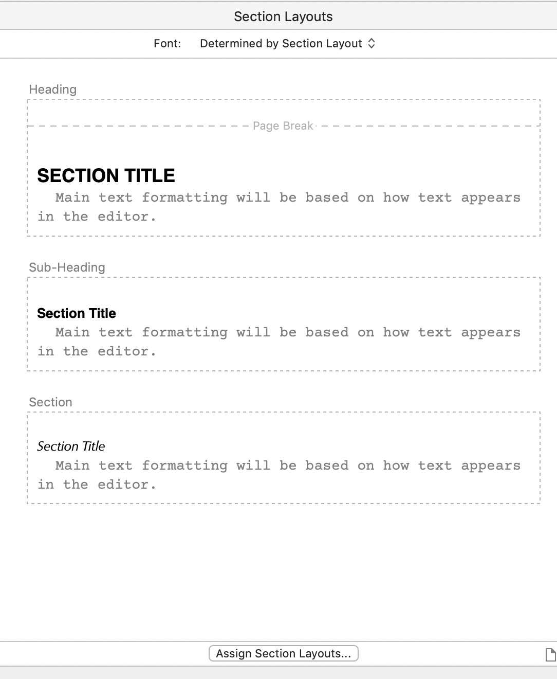 Finally, it is worth noting that Scrivener can distinguish folders and documents at different levels of hierarchy in the Binder as of different Type automatically, if you wish. So, if your work is well-structured in the Binder in a way that reflects part/chapter/section/subsection etc, then all you need to do is tell your compile format what each level of the heirarchy should look like – that is assign each level to a Section Layout that gives it its look (including possibly titling etc).