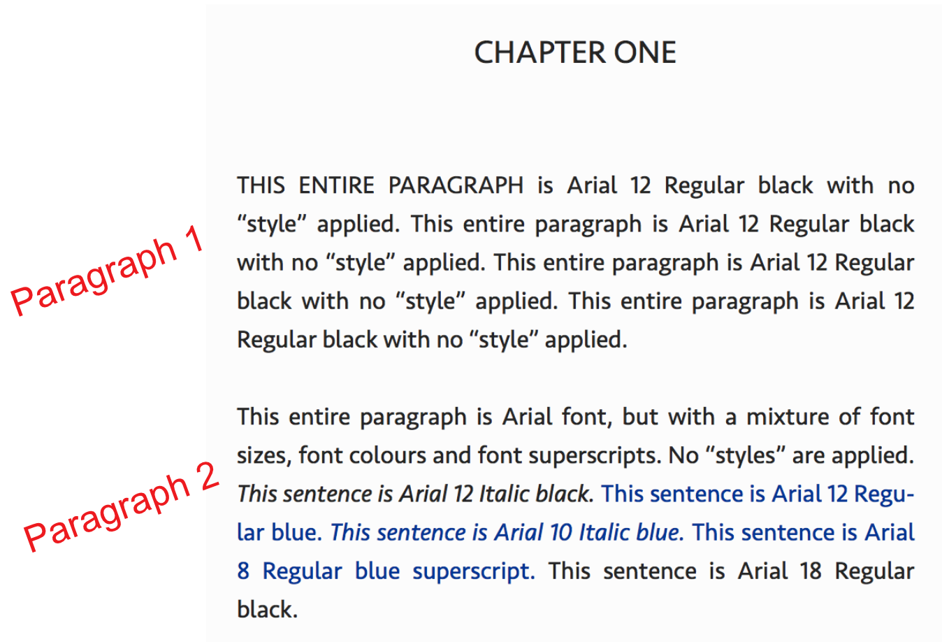 When I compile, “Paragraph 2” does not come out fine. Some font attributes come out unchanged (the Arial font itself, the font colour and the italics attribute). But the compile process changes other font attributes (font size, font superscripts). As such, the ePub 3 output no longer matches the font settings in Editor.
