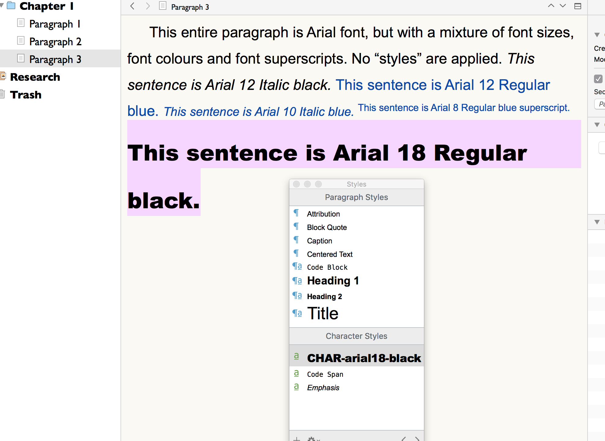 I’ve used pomme’s scrivener file, and I’ve duplicated the second paragraph to a third document, then selected the text in Arial Black 18 and created a Character style CHAR-arial18-black from it (ignore the purple, that’s just the highlight):