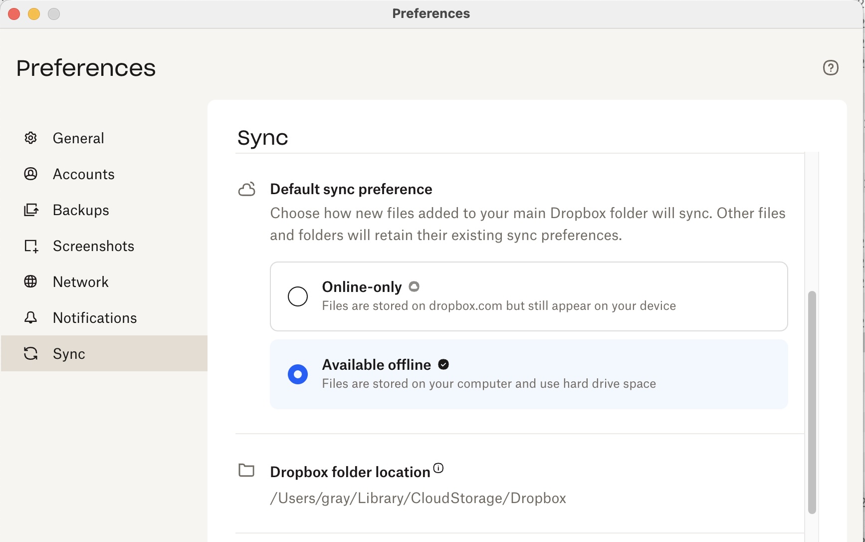 Dropbox Preferences > Sync — no selective sync option visible that would fix this