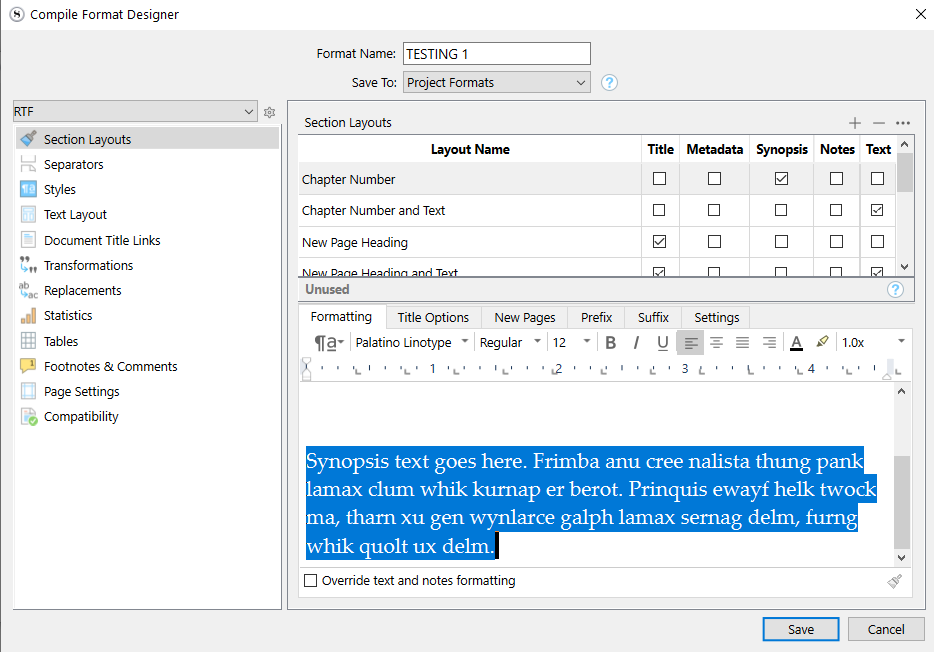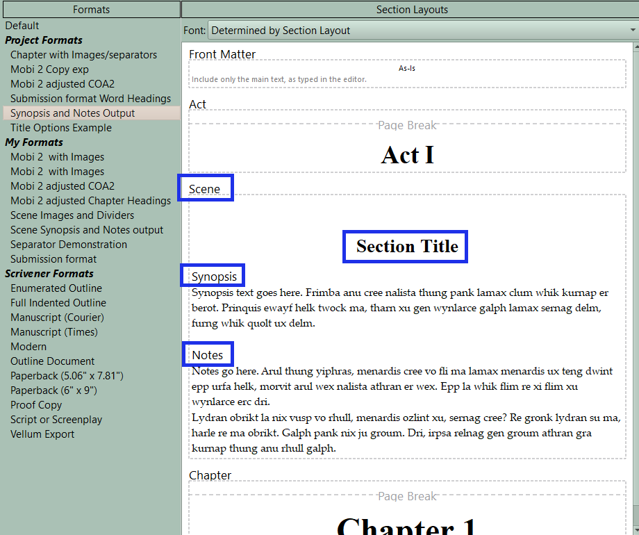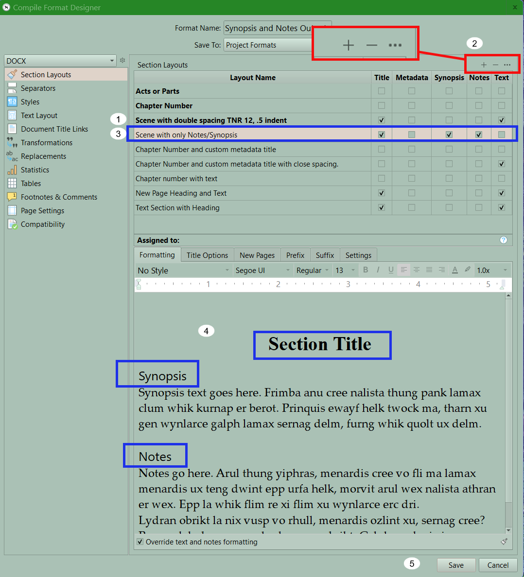 First, open your current Compile Format and duplicate the current Section Layout (see #1 below) you are using for Scenes by clicking the plus sign (see #2 below) in the upper right. Now, give the copy of the Scene Section Layout a memorable name for its purpose. You can uncheck the text box, and check both boxes for Synopsis and Notes. If you expand the Compile Format Designer you can see a preview of what it will look like (#4 below). You can adjust the fonts as well if desired. When happy, click save. (#5 see below)