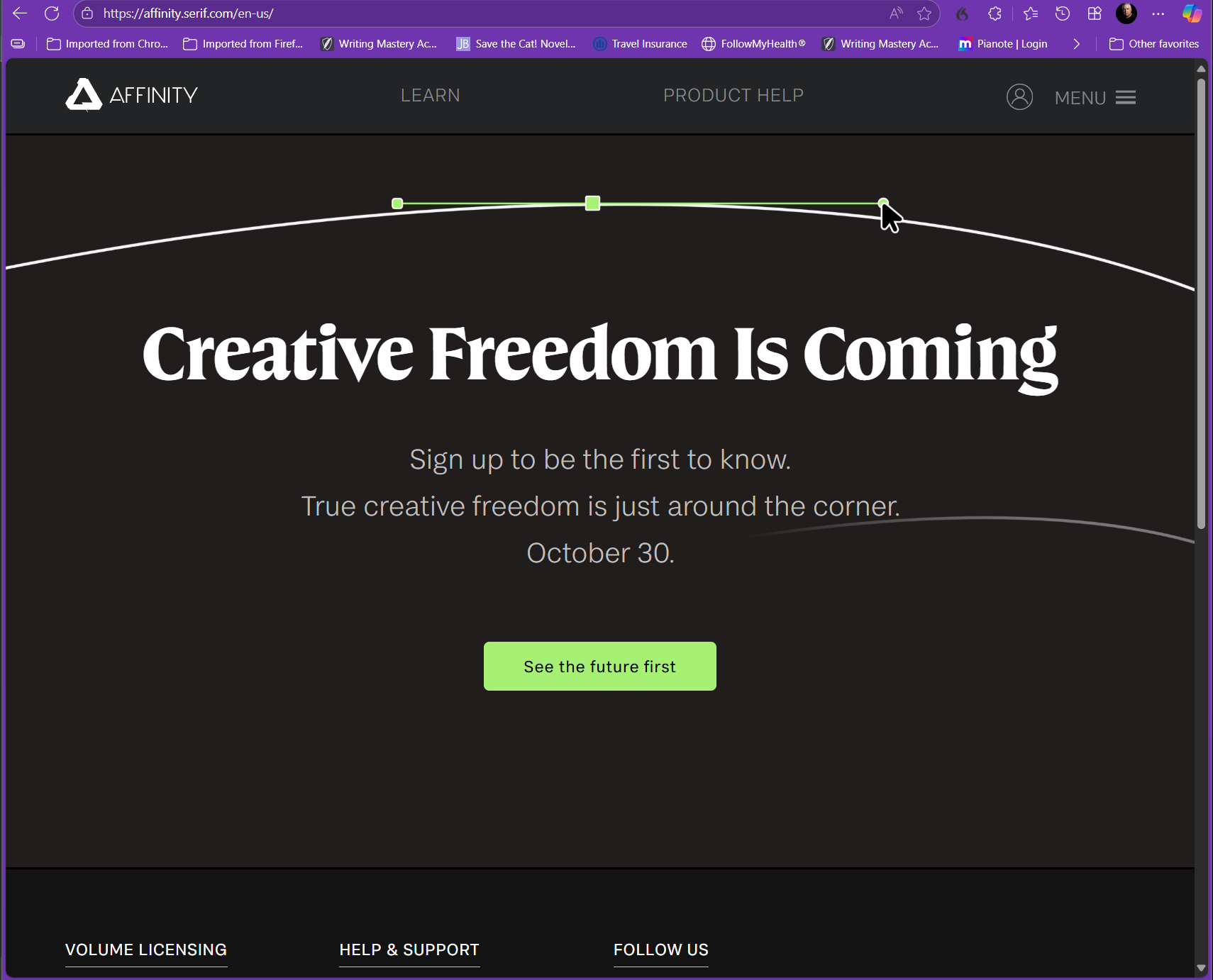 I have been using Adobe products, particularly InDesign and Photoshop, for book design (cover and interior layout) for my publishing house. Because I’m stepping back from publishing to focus on my own fiction novels, this is a good time for me to try an alternative, the Affinity suite. Unfortunately, I can’t purchase it just now as Canva has acquired Affinity and is about to relaunch a new version of the software and/or a subscription model (which it has publicly denied); it’s stopped selling the current version of its software.