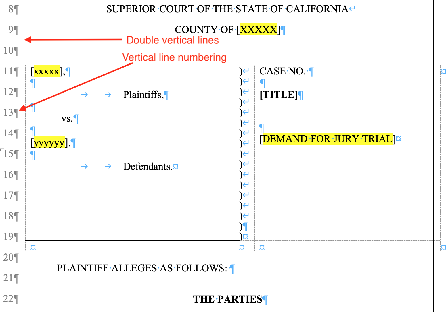 I am a trial attorney and use Scrivener heavily. Much of my work ends up having to be compiled into MS Word documents for collaboration with others inside and outside my firm. In legal pleadings in California, we have to have a vertical double line in the left margin of the document and line numbers down the page (see screenshot). My Word templates provide for this. Is it possible in Scrivener (macOS) to either