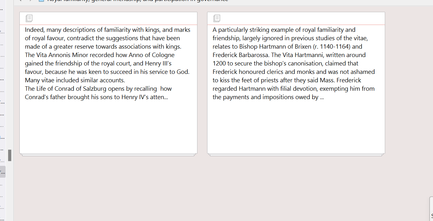 I think it’s because in most cases the title of an item, and if that is not sufficient, a description by which one identifies a section, is enough to understand the contents represented by that card, in a symbolic sense like we would think of an icon representing the contents of a file on the disk. You are it seems coming from a different kind of software that affords one little or no such summary view, and thus one can only ever identify the structure of their work by skimming through vast quantities of text and moving those entire quantities around on large management boards.