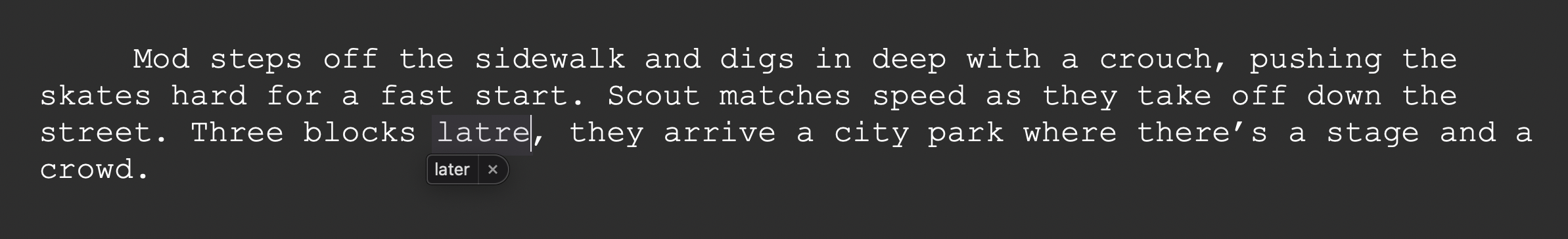 In MacOS 3, Scrivener offers a correct spelling under the mis-spelled word. I can get it to make the correction by hitting ‘return’ but that drops the cursor to the next line. I’ve tried various key-combos and checked the manual, but how to I accept the correction and leave the cursor at the end of the corrected word?