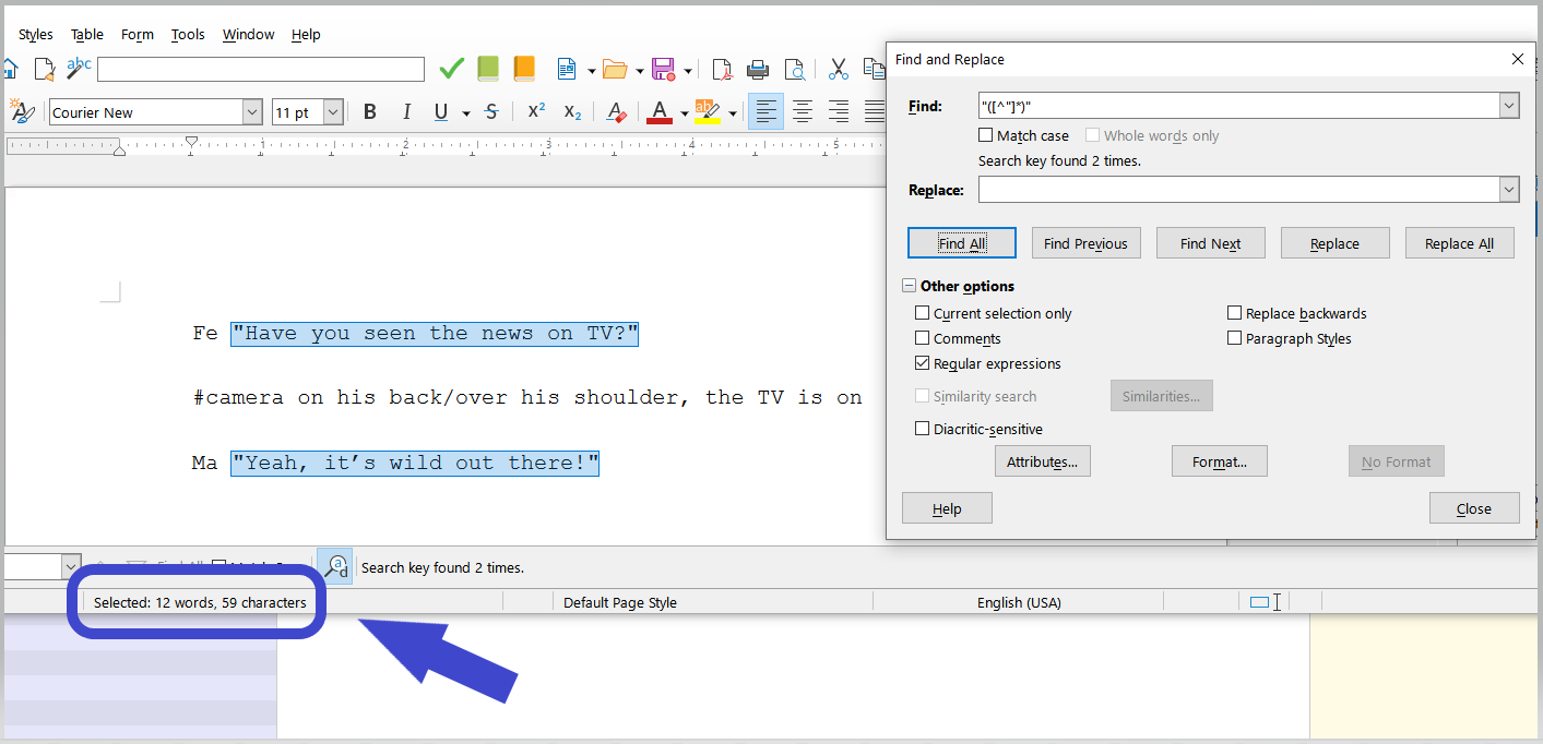 On my document, the word count below gives me a total of 25 words. I’m looking for a way to count only the words for the dialogues, the ones in quotes, which is what the player will read. Without the Characters (Fe and Ma) and the comment in the middle (everything in the line after the #), the total world count should be 12, not 25.