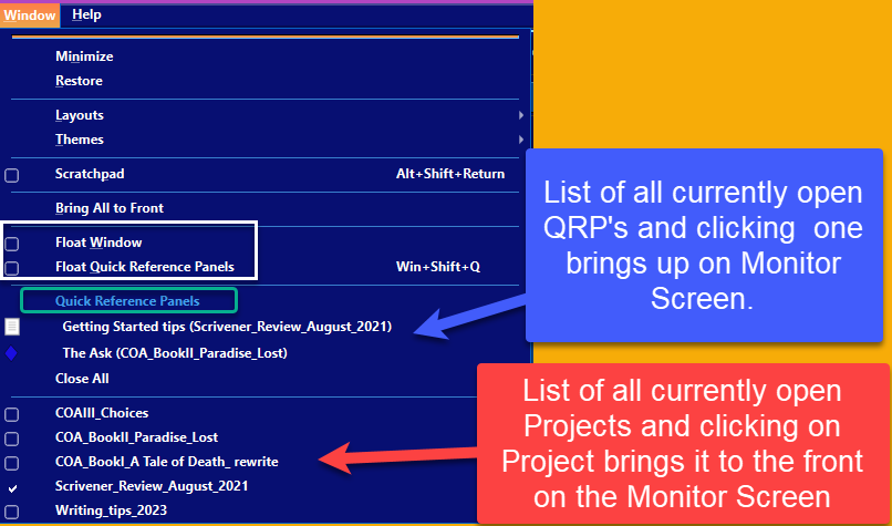 @AmberV Minor point, admittedly, but may I suggest, re UI & documentation, that “float” is not the same as “keep on top”? For me, “Float” is the inverse of “Dock(ed)”. AFAICT, Quick Ref windows are always floating, and can’t be docked, but they can be “Always On Top” or not.