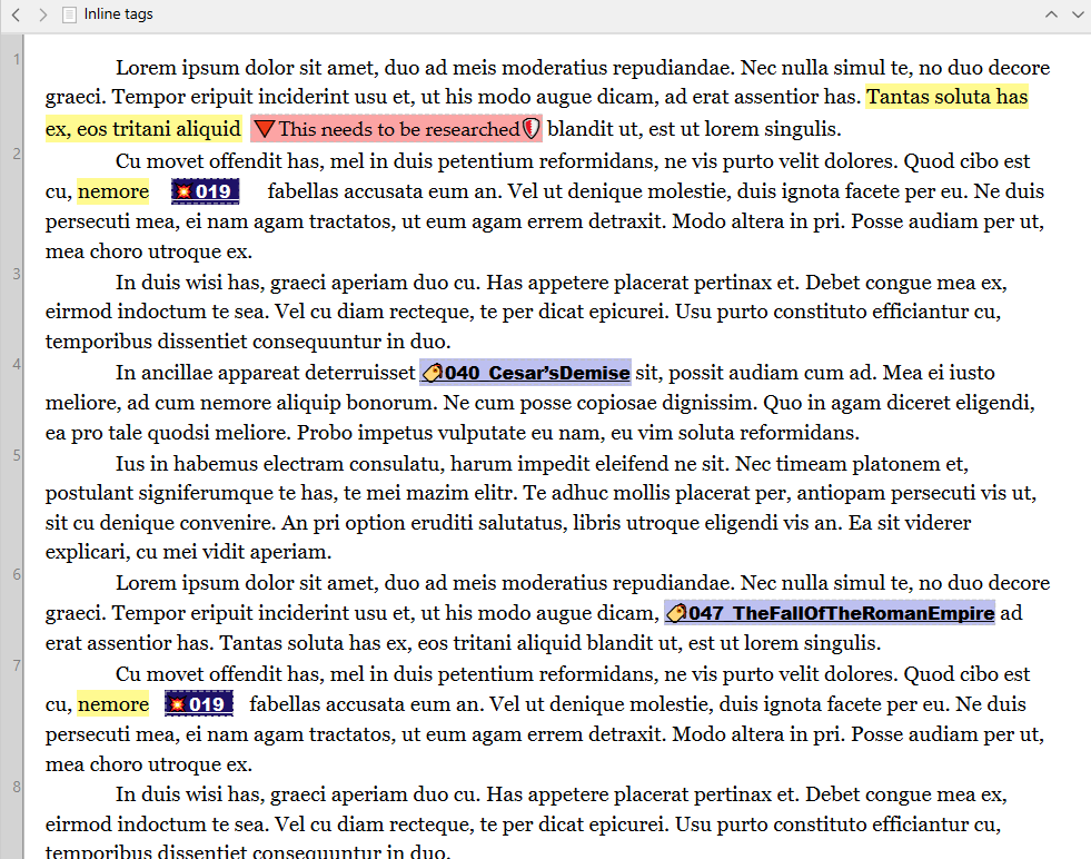 Hey Keith - Just wanted to throw my +1 behind this idea. From a fiction writerās point of view, Iād love to be able to highlight portions of story text, say a passage that explains some of a characterās past history, tag it as āJohnās Bio,ā and then have that text (and otherās so tagged) show up in that characterās bio, down in the character container.