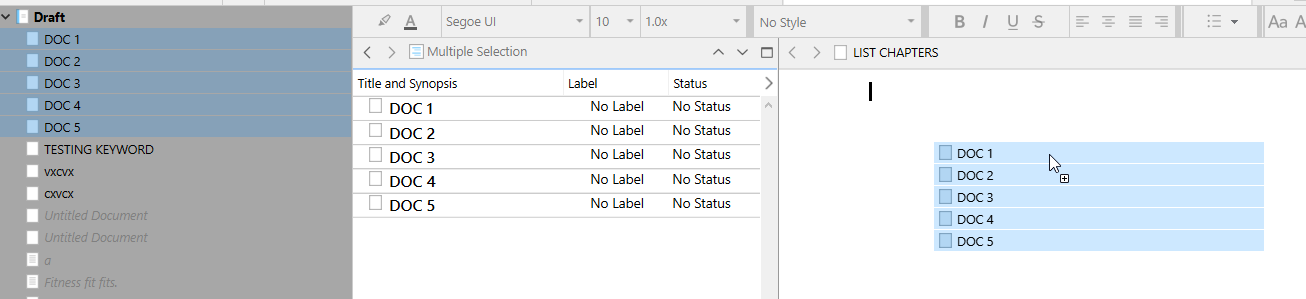 Of course, this just gives you a piece of paper (or PDF) with just the titles. If you want a document that you can work with, then just select the relevant documents in the binder, cmd-c to copy, switch to another editor such as Word and then cmd-v to paste. Youâll get the chapter titles as a simple list which you can then manipulate.