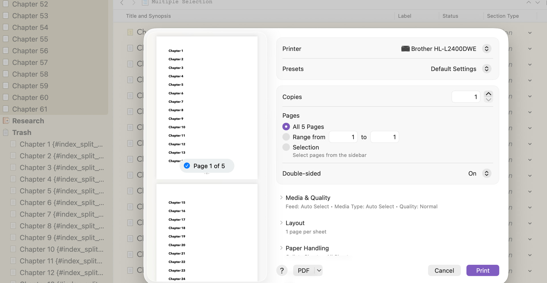 And an example print dialogue (here the Binder documents just happen to be called âChapter 1â, âChapter 2â etc â yours will reflect your document titles as well.
